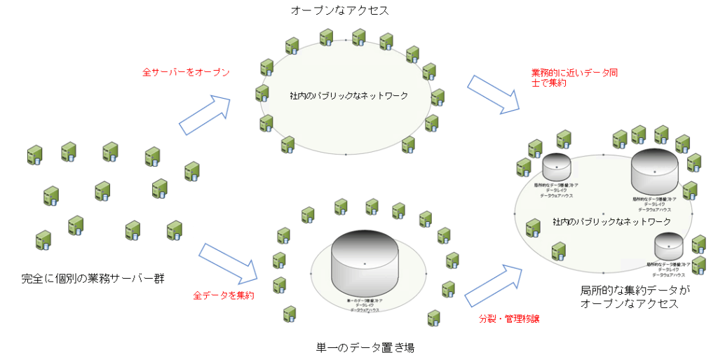 ② まずは完全統一のデータ共有基盤を作り、それらが崩壊するようにして分裂していく