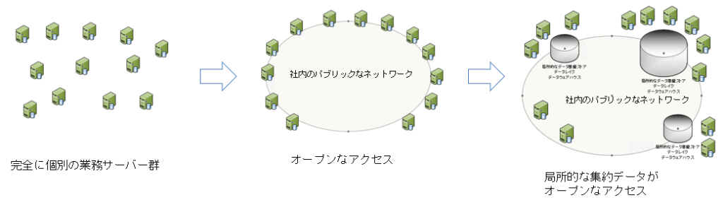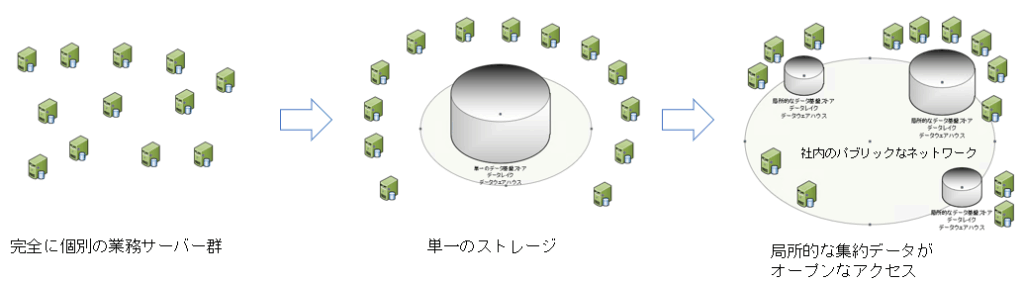 その結果、各利用者は、足りないデータを補うように、また、業務ドメインに特化した独自の共通データをこしらえるようになり、それぞれで集約ストレージが生まれて主役が移っていきます。